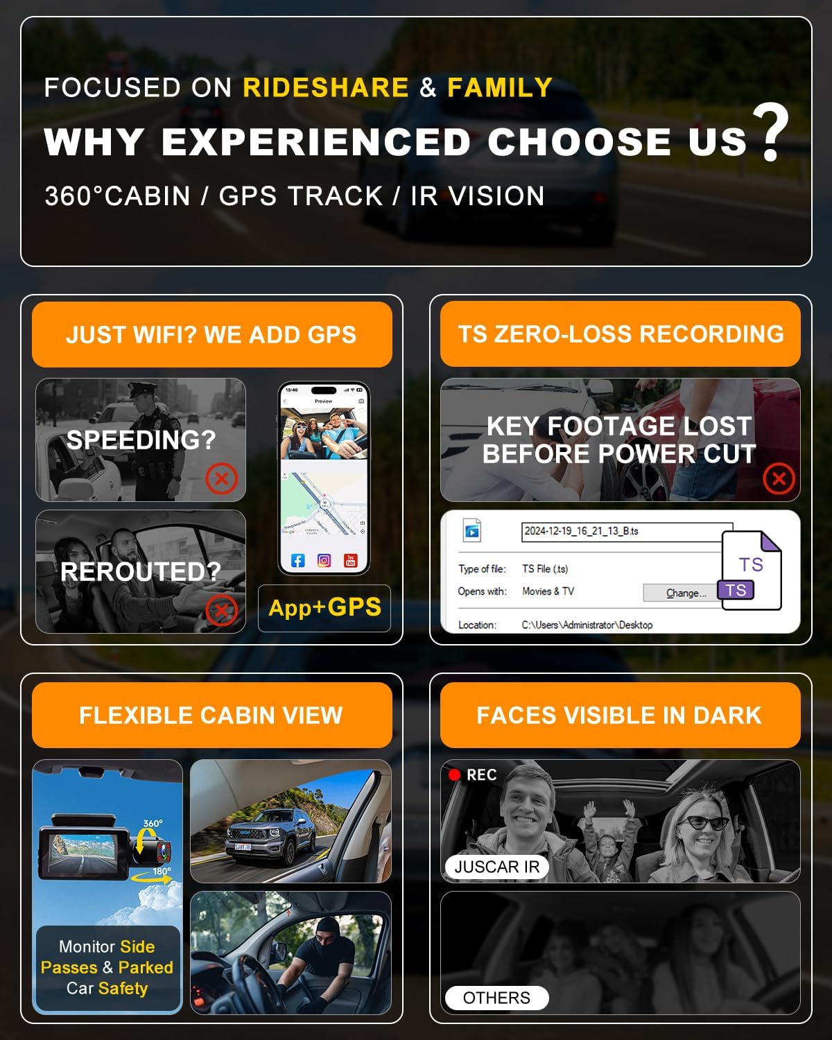 2.5K yüksek çözünürlüklü ön kamera ve 1080P iç kamera sayesinde hem yol görüntülerini hem araç içini aynı anda kayıt altına alın. Ride-share sürücüler, aileler ve güvenlik odaklı kullanıcılar için tasarlanmış akıllı dashcam sistemi ile sürüşlerinizi güvence altına alın.