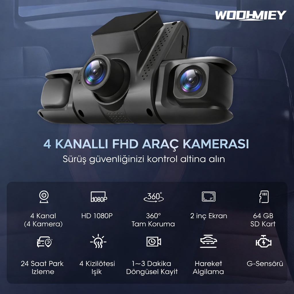 • 📸 4 Kanal ile Tam Kapsama: 4 farklı kamera açısı sayesinde aracınızın çevresini ve içini 360 derece kontrol altına alın.