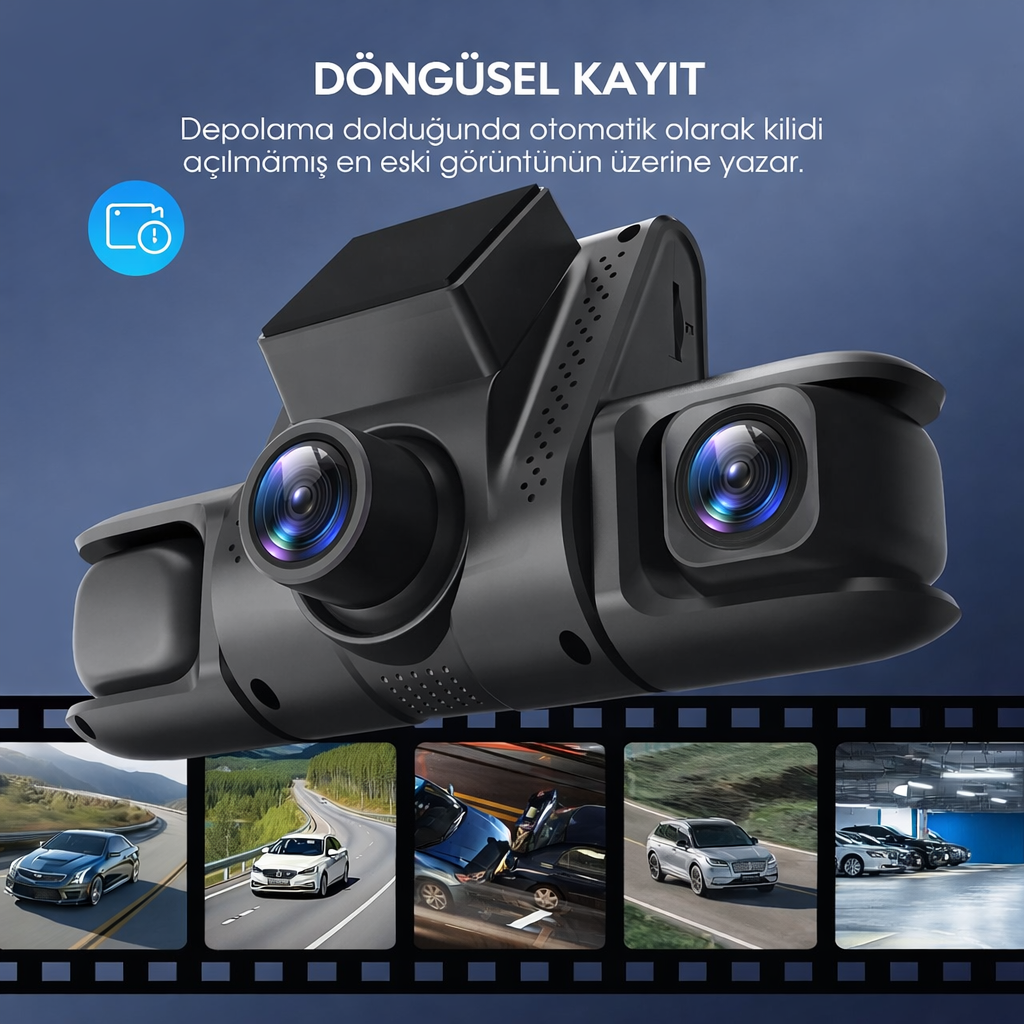 • 🔄 Döngüsel Kayıt: Hafıza kartı dolduğunda en eski (kilitlenmemiş) videoların üzerine otomatik yazarak kaydın durmasını engeller.