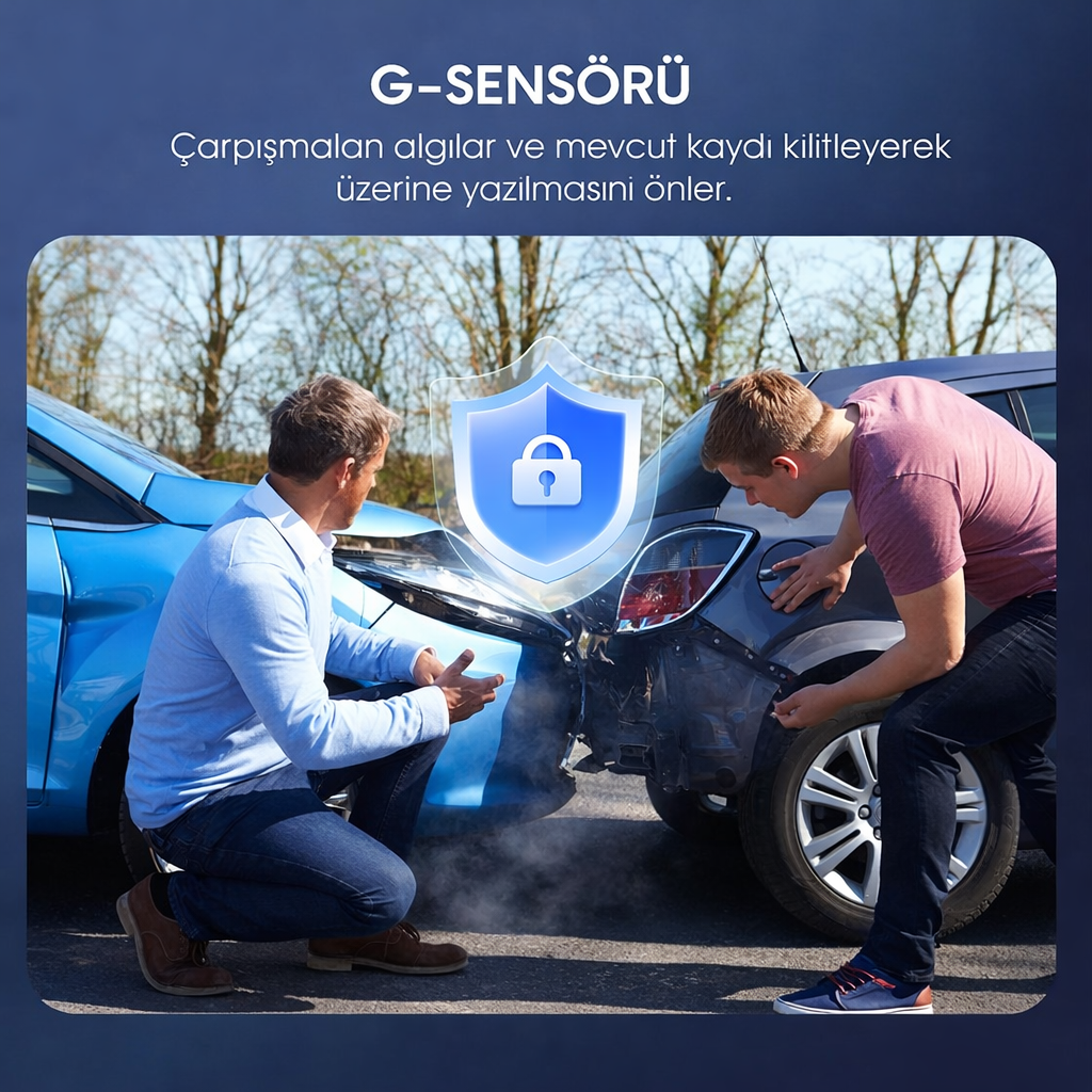 • 🔒 G-Sensör & Acil Kilitleme: Bir çarpışma anında kamera durumu algılar ve o anki kaydı silinmemesi için otomatik olarak kilitler.